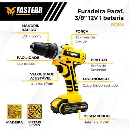 Furadeira e Parafusadeira de Impacto 12V Fasterr FST006 com Maleta e Acessórios